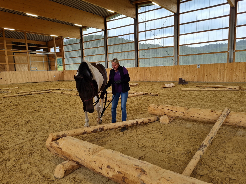 Bei uns in den Bergen gibt es aber immer wieder extreme Wetterverhältnisse. Allein im Sommer 2021 hatten wir monatlich durchschnittlich zwischen 16 & 19 Regentage und im Mai lagen die morgendlichen Temperaturen zum Teil bei – 3°C. Außerdem haben wir meistens mindestens ein halbes Jahr eine geschlossene Schneedecke. Daher haben wir uns entschlossen, eine mobile Extreme-Trail-Anlage zu bauen. Diese können wir in der Reithalle oder bei schönem Wetter draußen aufbauen und somit sind wir sehr flexibel.